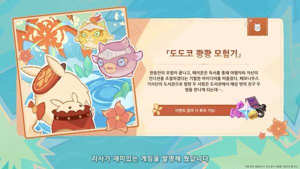 클레 관련 이벤트다. 기사단은 침입자를 처치하는 동안 클레가 사고를 치지 못하도록 몬드성에 남겼다. 클레가 심심하지 않게 재미있는 게임도 발명해서 선물했다. 도도코 쾅쾅 모험기다.