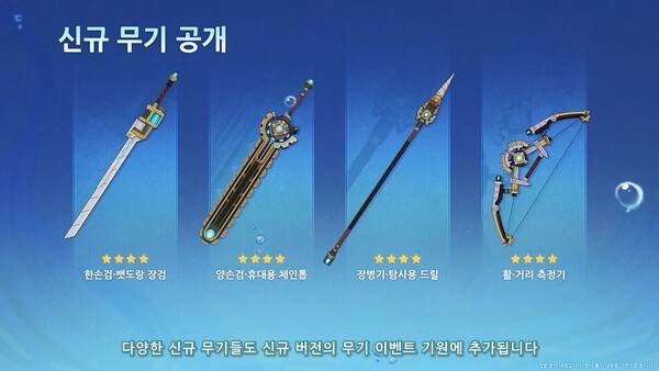 신규 5성 무기로는 '영원히 샘솟는 법전' 법구와 '현금 흐름 감독' 법구가 등장한다. 4성은 한손검 '뱃도랑 장검', 양손검 '휴대용 체인톱', 장병기 '탐사용 드릴', 활 '거리 측정기'를 만나볼 수 있다.