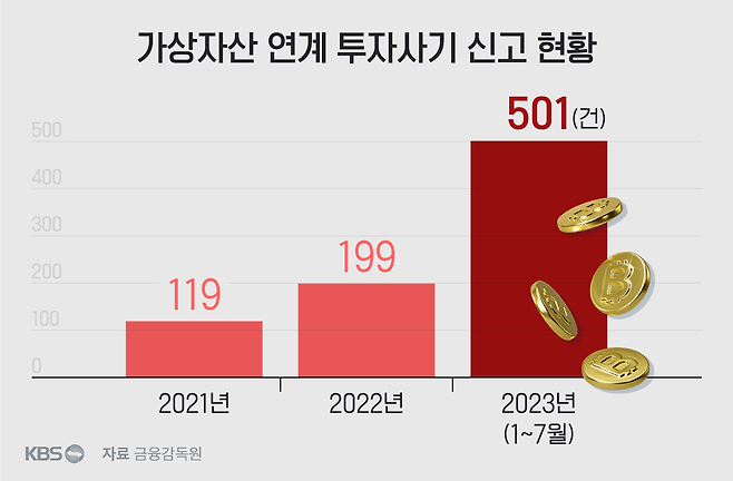 금감원이 지난 6월 가상자산 관련 사기를 전담하는 신고센터를 설치된 뒤 피해 접수는 폭증했습니다. 6월부터 두 달여 동안 신고 건수만 406건에 달합니다. 접수된 피해의 상당수는 가상자산 관련 '고수익 보장 사기'입니다.