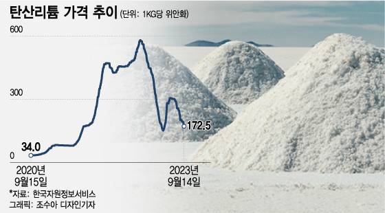 배터리 핵심 원료인 탄산리튬의 가격이 추락한다. 글로벌 공급 과잉 우려가 제기되면서다. 국내 배터리 업체들은 이에 따른 수익성 악화를 걱정하고 있는 눈치다. 에코프로, LG에너지솔루션 등 국내 이차전지주(株)는 벌써부터 리튬 가격을 따라 하락 중이다.