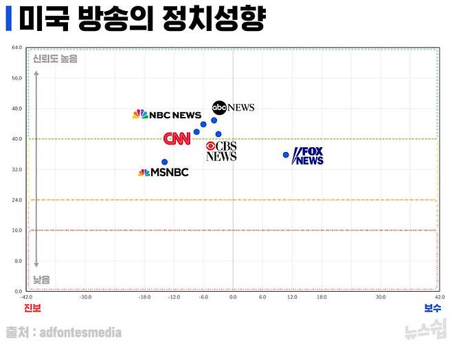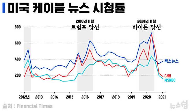 2003년 미국의 이라크전을 거치며 케이블 뉴스는 자신의 정체성을 드러냈다. 특히 폭스뉴스가 그랬다. 폭스뉴스를 본 시청자는 이라크와 알카에다가 연계되어 있고, 대량살상무기가 발견됐다고 믿는 경향이 높게 나타났다. 또 국제적인 여론이 미국의 이라크 전쟁을 지지한다고 생각하는 경향이 폭스뉴스 시청자에게 나타났다. 이라크전을 거치며 2010년대까지 폭스뉴스는 점차 더 보수화된 정치 성향을 내비쳤고, MSNBC는 진보 성향, CNN은 중도 진보적 성향으로 자리매김했다. 이런 상황에서 언론사들은 트럼프라는 독특한 캐릭터의 대통령을 맞이하게 된다.