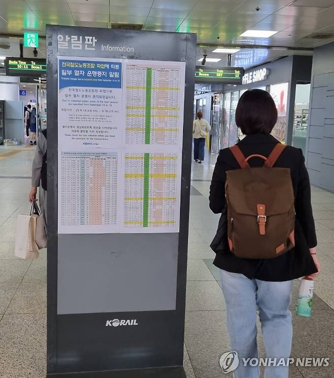 (대전=연합뉴스) 박주영 기자 = 16일 오전 대전역 대합실에 철도노조 파업에 따른 일부 열차 운행 중지 방침을 알리는 게시글이 붙여져 있다. 2023.9.16