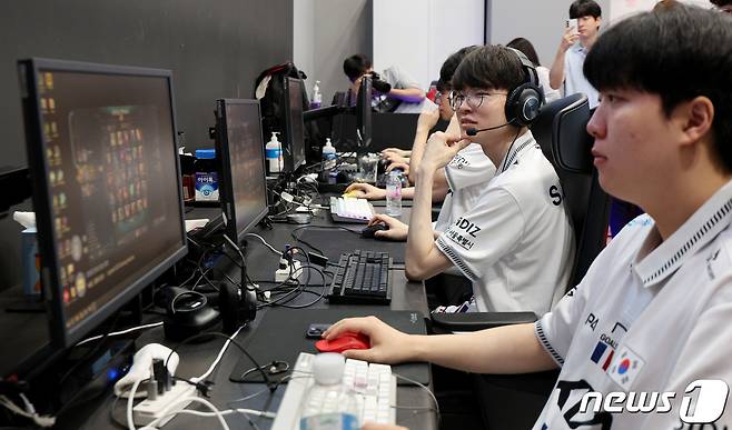 (서울=뉴스1) 장수영 기자 = 항저우 아시안게임에 출전하는 '리그 오브 레전드' 국가대표 선수들이 16일 서울 마포구 에스플렉스센터 e스포츠 명예의전당에 마련된 연습실에서 훈련을 하고 있다