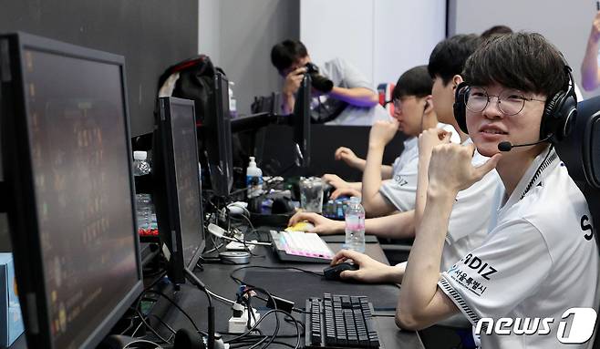 (서울=뉴스1) 장수영 기자 = 항저우 아시안게임에 출전하는 '리그 오브 레전드' 국가대표 선수들이 16일 서울 마포구 에스플렉스센터 e스포츠 명예의전당에 마련된 연습실에서 훈련을 하고 있다