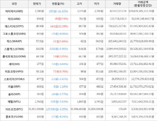 하락세를 보이는 가상화폐는 총 9종목으로 이 중 가장 큰 하락세를 보이는 하이파이는 전일 대비 -11.32% 하락한 2,780원에 거래되고 있다.