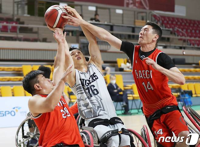 (서울=뉴스1) = 17일 오후 상주실내체육관에서 열린 '2023 KWBL 휠체어농구리그' 대구광역시청와 춘천타이거즈 경기에서 대구 김지남(오른쪽)이 춘천 이윤주의 슛을 수비하고 있다. (한국휠체어농구연맹 제공) 2023.9.17/뉴스1