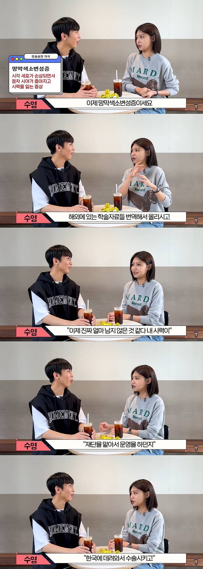 한솔은 "아버님이 실명을 한 후 대하는 행동 중 달라진 게 있냐"고 물었고 수영은 "익숙했다. 아빠를 혼자 두고 어디 가면 안 되고 어디 갈 때는 팔꿈치잡고 안내를 해야 하고 상에는 뭐가 있다 (알려주는) 이런 생활이 익숙하다"고 밝혔다.
