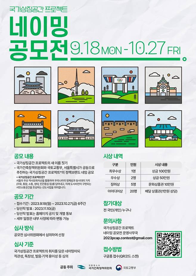국가건축정책위원회와 국토교통부는 국가상징공간 프로젝트의 정책 브랜드명을 위한 아이디어 공모를 진행한다고 18일 밝혔다.