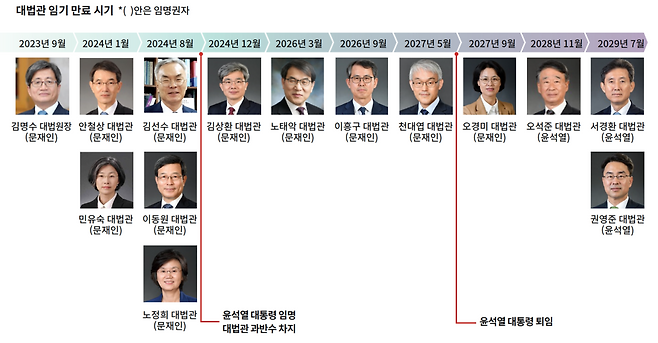 대법원은 대법원장 한 명과 대법관 13명으로 구성된다. 임기는 6년이다. 윤석열 정부 5년 동안 대법원 구성원 전체 14명 중 13명(대법원장 및 대법관 12명)이 바뀐다(위 그림 참조).