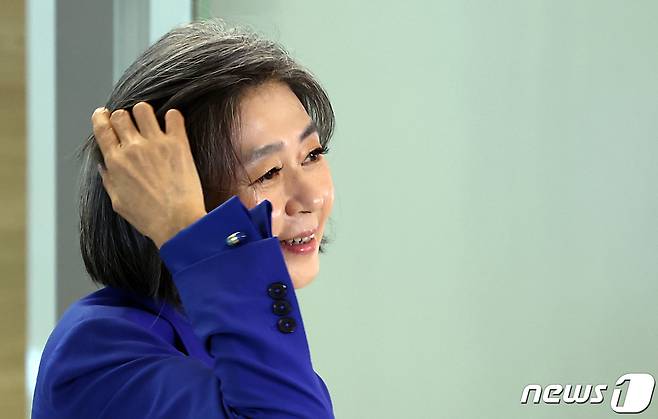(서울=뉴스1) 박정호 기자 = 김행 여성가족부 장관 후보자가 18일 오전 서울 종로구의 한 빌딩에 마련된 인사청문회 준비 사무실로 출근하고 있다. 2023.9.18/뉴스1