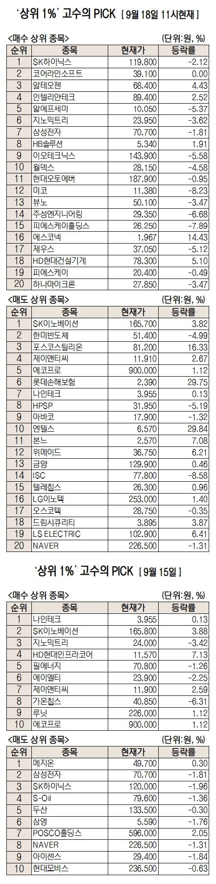 이날 미래에셋엠클럽에 따르면 미래에셋증권 주식 거래 고객 중 최근 1개월 간 투자수익률 상위 1%에 해당하는 '주식 초고수'들이 오전 11시까지 가장 많이 사들인 종목은 SK하이닉스로 집계됐다.