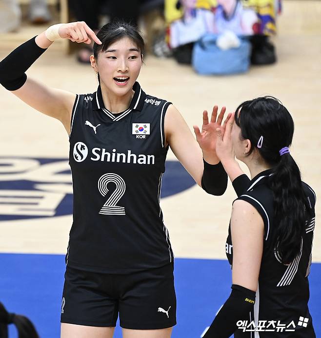이번엔 힘없이 무너지지 않았다. 세자르 감독에 앞서 한국 대표팀을 이끌었던 스테파노 라바리니 감독의 폴란드와 대등하게 맞섰다. 아웃사이드 히터 박정아(페퍼저축은행)와 강소휘(GS칼텍스), 미들블로커 정호영(정관장)과 이주아(흥국생명), 세터 김다인(현대건설), 리베로 김연견(현대건설)으로 선발 라인업을 꾸렸다.