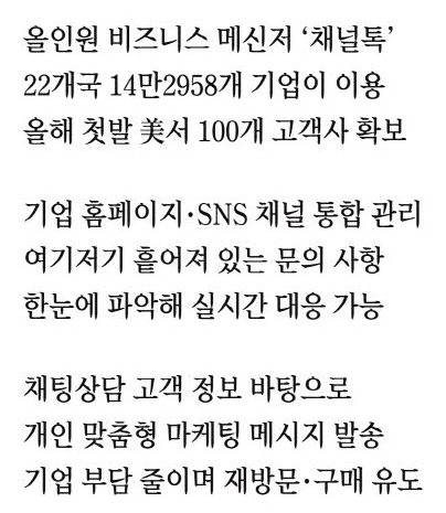 채널톡은 챗봇(채팅로봇) 상담, 고객관계관리(CRM) 마케팅, 팀 메신저를 하나로 통합한 올인원 비즈니스 메신저다. 2017년 채널코퍼레이션이 채널톡 서비스를 선보였다. B2B(기업 간 거래) 서비스형 소프트웨어(SaaS) 방식으로 기업을 지원한다. 9월 14일 현재 전 세계 22개국, 14만2958개 브랜드(기업)가 채널톡을 이용 중이다. 스타트업을 비롯한 중소·중견기업(SMB)뿐 아니라 대기업 계열사도 고객으로 두고 있다.