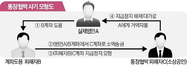 임 작가가 당한 사기는 범죄자 A가 명의를 도용한 피해자 B의 돈으로 제3자인 C의 계좌를 지급 정지시키는 신종 보이스피싱 수법으로, 통장 협박으로 불린다. 입금자명을 텔레그램 아이디로 적는 이유는 통장 협박 피해자가 사기범인 자신에게 직접 연락하게 만들기 위해서다. 연락이 이뤄지면 사기범은 수백만원의 돈을 내야 지급 정지를 해제해주겠다고 협박한다. 실제 사기범은 지급 정지를 해제해줄 권한이 없지만 법을 모르는 일부 피해자는 ‘울며 겨자 먹기’로 돈을 보내는 경우가 적지 않다. 통장 협박 피해자 C가 최대한 빨리 동결된 계좌를 풀기 위해선 명의도용 피해자 B와 합의해야 하지만, B와 연락이 닿는 것조차 쉽지 않아 보통 계좌가 정상화되는 데까지 3개월이 걸린다.