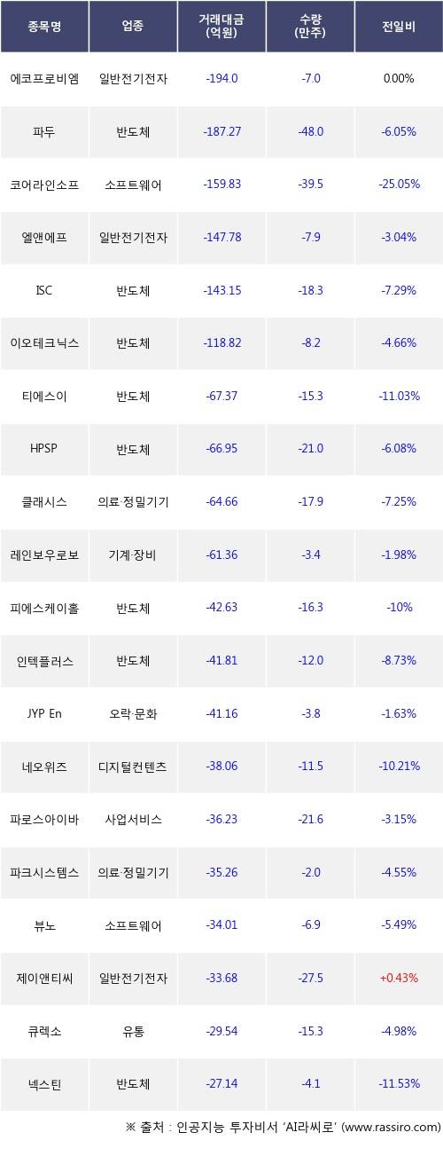 기관 투자자의 순매도 상위 20개 종목은 에코프로비엠, 파두, 코어라인소프트, 엘앤에프, ISC, 이오테크닉스, 티에스이, HPSP, 클래시스, 레인보우로보틱스등이다.
