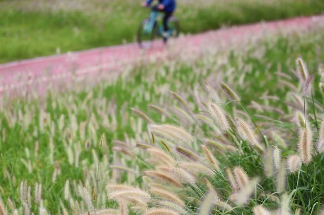 낮 최고기온 29도 맑은 날씨를 기록한 18일 대전 유성구 갑천변에서 만개한 수크렁 풀밭 사이로 한 시민이 자전거를 타고 지나가고 있다.