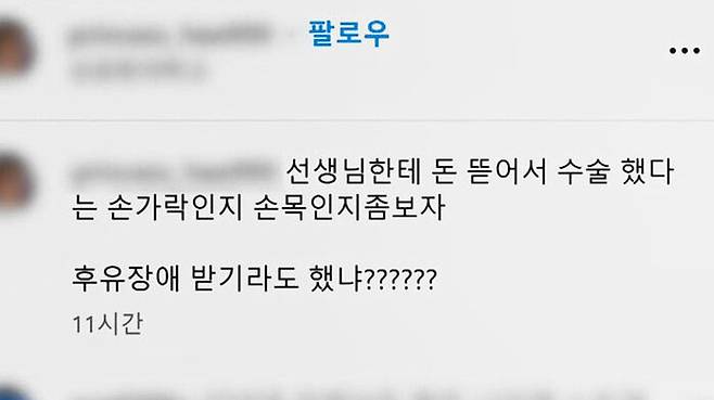 "선생님한테 돈 뜯어서 수술했다는 손가락인지 좀 보자"