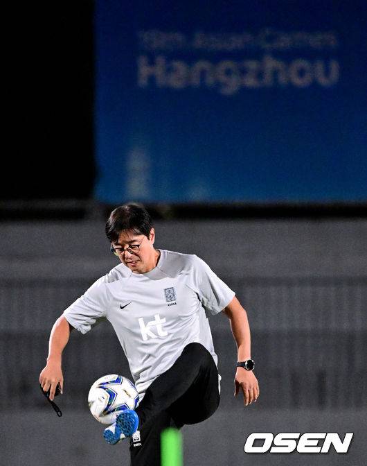 한국 황선홍 감독이 훈련을 앞두고 공을 차고 있다. 2023.09.18 / dreamer@osen.co.kr