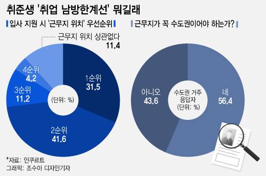 HR(인적자원) 컨설팅 기업인 인쿠르트가 올해 3월 취업준비생들을 상대로 조사한 설문조사에서 응답자 대부분이 근무지를 취업 주요 우선순위로 꼽았다. 1순위(31.5%), 2순위(41.6%)로 답한 이들이 가장 많았고, 3순위로 꼽은 응답은 11.2%로 뚝 떨어졌다. 그 중에서도 수도권 거주 지원자들은 절반 이상이 무조건 수도권에서 근무하겠다고 답했다. 재계 관계자는 "기업들이 R&D센터 등을 서울에 가까운 곳에 짓는 이유 자체가 채용 목적이 크다"며 "마음 같아선 서울에 짓고 싶지만 지을 곳이 없어서 이른바 남방한계선 안에 짓는 것"이라고 말했다.
