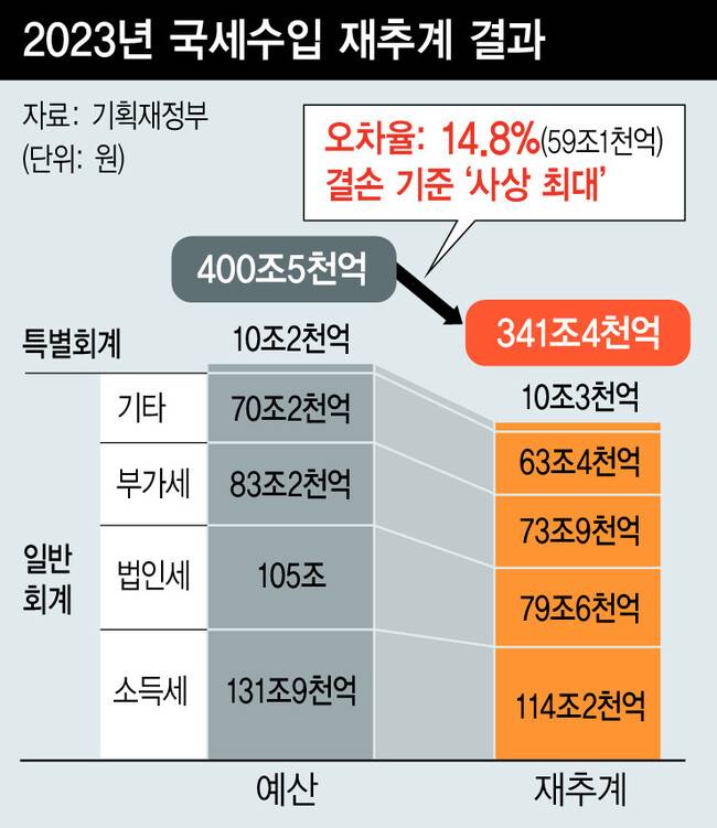 재추계 결과를 적용한 국세 수입 오차율(세입 예산 대비 오차액 비중)도 올해 14.8%로 2021년(21.7%), 2022년(15.3%)에 이어 3년 연속 두 자릿수를 기록할 전망이다. 2021년과 지난해에는 이례적인 대기업 실적과 자산시장 호황 등으로 국세 수입이 정부 예상보다 각각 61조3천억원, 52조6천억원 더 걷히는 초과 세수가 발생한 바 있다. 이번 재추계에 따른 올해 재정적자 전망치(94조3천억원)와 기재부가 작년 말에 추정한 올해 명목 국내총생산액(2238조4천억원)을 고려하면 올해 명목 국내총생산 대비 재정적자 비율도 4.2%에 이를 전망이다.