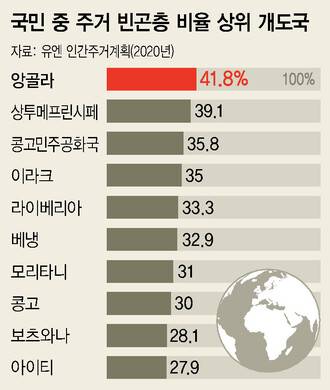 2020년 기준으로 열악한 주거 환경에서 사는 이들의 비율이 가장 높은 나라는 앙골라로, 전체 국민의 41.8%에 달했다. 아프리카 서부의 작은 섬나라 상투메프린시페(39.1%), 콩고민주공화국(35.8%), 이라크(35%), 라이베리아(33.3%), 베냉(32.9%), 모리타니(31%), 콩고(30%)도 전체 인구의 30% 이상이 주거 빈곤층이다. 아시아에서는 이라크 외에 파키스탄(20.8%), 방글라데시(19.8%), 아프가니스탄(19.1%)도 주거 빈곤층이 많은 나라로 꼽혔다.