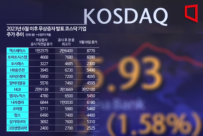 금융감독원 전자공시시스템에 따르면 지난 6월부터 무상증자를 실시한 코스닥 기업(권리락 미발생 기업과 유·무상증자 동시 진행 기업 제외)은 엑스페릭스·토마토시스템·포시에스 등 13곳이다.