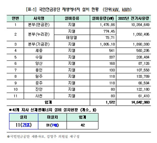 19일 국회 보건복지위원회 더불어민주당 김영주 의원이 국민연금공단으로부터 제출받은 자료를 분석한 결과, 국민연금 사옥 42곳 중(본부 3개소+지방 39개소) 26%에 해당하는 11곳에만 재생에너지 설비를 사용 중인 것으로 확인됐다. 재생에너지 설비를 사용하는 사옥 11곳 중 10곳은 지열을, 다른 1곳은 태양광을 에너지원으로 사용하고 있으며, 전체 설비용량은 5701kW이다.