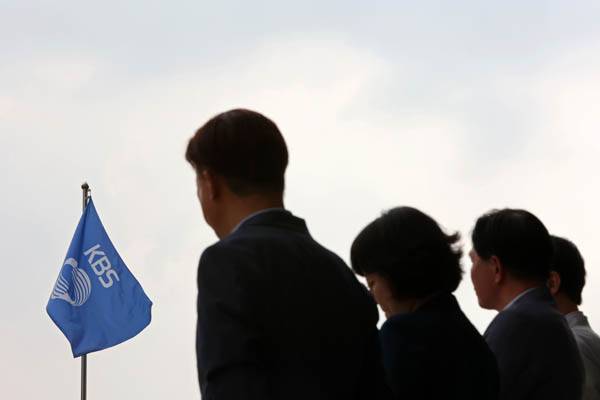 서울 영등포구 KBS 본관에서 김 사장의 해임제청안 처리에 항의하는 야권이사들 너머로 KBS 깃발이 펄럭이고 있다. 불어오는 바람에 좌우로 크게 흔들리고 있었다.