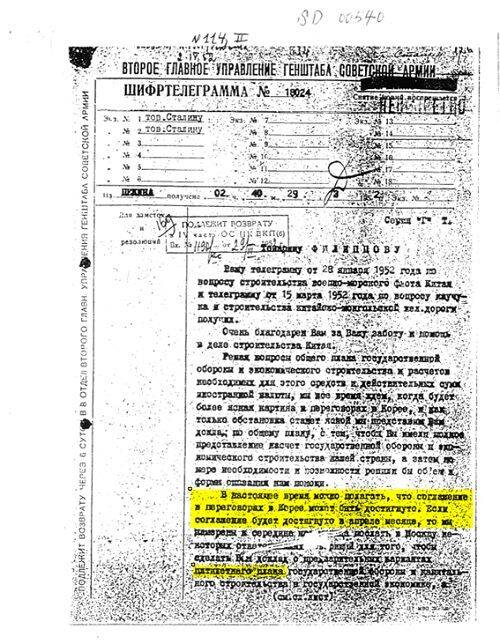 "지금은 휴전협상이 합의에 이를 수 있다고 생각됩니다. 1952년 4월에 합의에 이를 수 있다면, 11월 중순에는 우리 동료들을 모스크바로 파견해 국방과 국가 경제 건설 관련 기본 건설 5개년 계획 초안을 보고할 예정입니다. 소련 정부에게 전문가 파견, 기술, 장비 및 자재 제공 등의 체계적인 지원을 부탁하며, 대출도 요청드립니다."