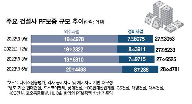 돈줄이 막힌 건설사들은 위기에 놓여 있다. 건설사의 PF 보증 규모 자체가 줄지 않고 착공·분양이 지연되면서 기존 우발채무는 해소되지 않는다. 나이스신용평가가 건설사 10곳(표 참고)의 PF 보증 규모를 집계한 결과 올 6월말 28조4781억원으로 지난해 9월말(27조3053억원)보다 1조1728억원(4.3%) 늘었다. 리파이낸싱 과정에서 시공사가 추가적인 신용 보강을 제공하는 사례가 생겨 부담은 더 늘어난다.