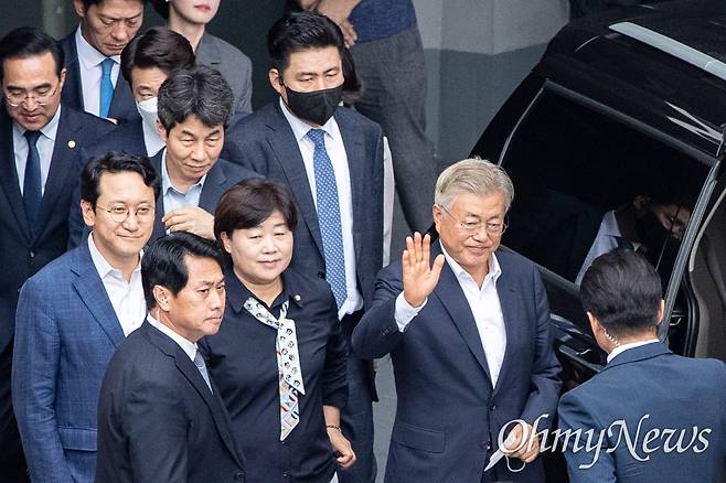 | ▲ 19일 오후 문재인 전 대통령이 단식투쟁 도중 건강이 악화되어 서울 중랑구 녹색병원에 입원한 이재명 더불어민주당 대표를 만난 뒤 떠나고 있다. |