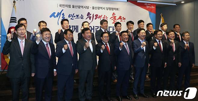 (서울=뉴스1) 임세영 기자 = 김기현 국민의힘 대표, 김두겸 울산광역시장 등 참석자들이 19일 오후 서울 켄싱턴호텔 여의도에서 열린 국민의힘 울산시당-울산광역시 당·정협의회에서 기념촬영을 하고 있다. 2023.9.19/뉴스1