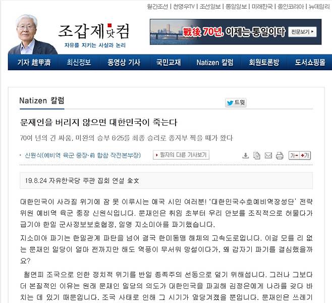 | ▲ 신원식 국방장관 후보자가 2019년 8월 서울 광화문에서 자유한국당(국민의힘 전신) 주최로 열린 집회에서 "이완용이 비록 매국노였지만 한편으론 어쩔 수 없는 측면도 있었던 것이 사실"이라고 발언한 사실이 뒤늦게 알려졌다. 사진은 해당 연설 전문이 실린 <조갑제닷컴> 홈페이지 갈무리. |