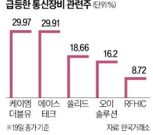 19일 케이엠더블유는 상한가(29.97%)로 거래를 마쳤다. 에이스테크도 가격제한폭(29.91%)까지 치솟았다. 쏠리드(18.66%), 오이솔루션(16.2%), RFHIC(8.72%) 등도 큰 폭으로 올랐다. 기관과 개인 투자자가 주가 상승을 이끌었다.