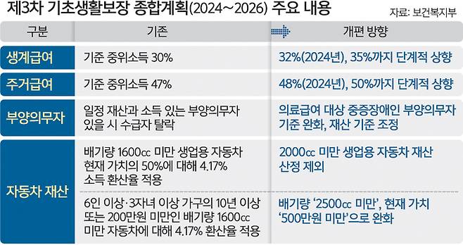 보건복지부는 19일 중앙생활보장위원회 심의·의결을 거쳐 이런 내용의 ‘제3차 기초생활보장 종합계획(2024∼2026)’을 발표했다. 기초생활보장 수급자를 선정할 때 가구의 소득인정액과 부양의무자 기준을 보는데 이들 기준을 완화하고 보장 수준을 강화하는 게 골자다.