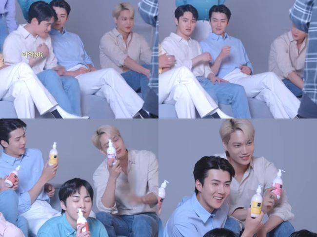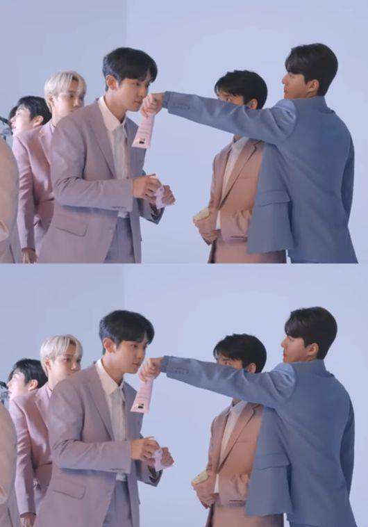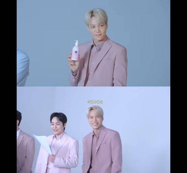 오묘하게 톤 다운된 올 핑크 수트도 거뜬히 소화한 카이는 폼 클렌징을 들고 “우와, 여행 다닐 때도 들고 다닐 수 있대!”라며 능숙한 연기를 선보였다. 그러자 카이 바로 옆에 있는 세훈은 도도한 흰 얼굴에 호기심을 띄우고 고개를 끄덕인다.