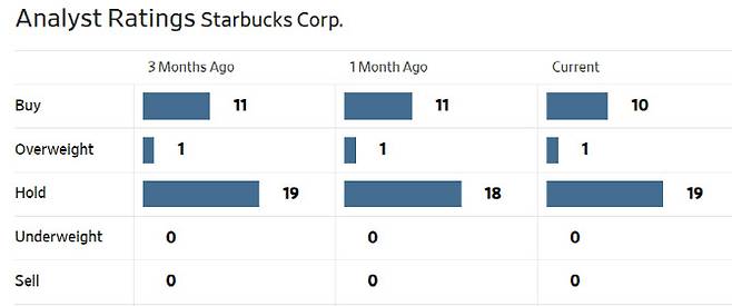 한편 월가에서 스타벅스에 대해 투자의견을 제시한 애널리스트는 총 30명으로 이 중 11명(36.7%)만 매수(비중확대 및 시장수익률 상회 등 포함) 의견을 유지하고 있다. 평균 목표주가는 113.3달러로 이날 종가보다 19% 높다.