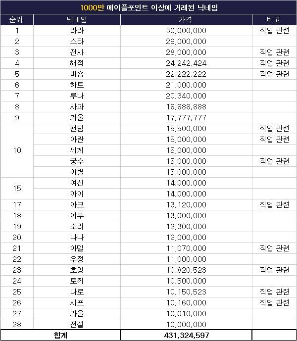 라라뿐만 아니라 전반적으로 두 글자 직업 이름의 닉네임이 고가에 거래됐다. 2000만 메포 이상에 거래된 7개 닉네임 중 라라, '전사', '해적', '비숍' 4개가 메이플스토리 직업과 관련됐다. 1000만 메포 이상의 경우 42%에 해당하는 12개가 직업명이다.