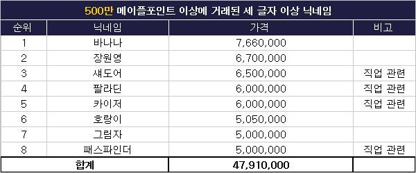500만 원 이상에 거래된 닉네임은 무려 127개에 달한다.