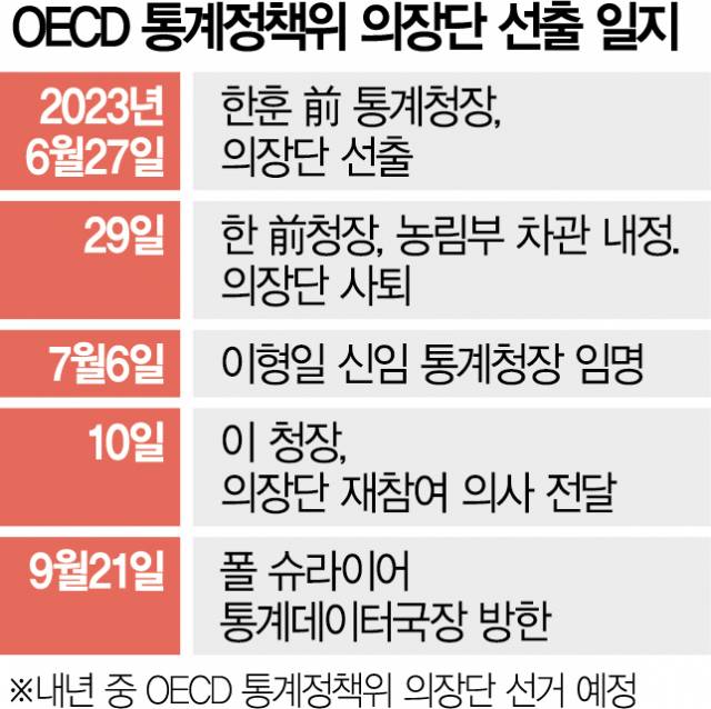 20일 서울경제신문과 국회 기획재정위원회 소속 서영교 더불어민주당 의원의 공동 취재에 따르면 통계청은 이달 21일 ‘경제 회복성을 위한 새로운 데이터 국제회의’ 참석차 방한하는 폴 슈라이어 OECD 통계데이터국장에게 우리나라의 의장단 재합류 의사를 전달할 예정이다. 이를 위해 이형일 통계청장은 7월 슈라이어 국장에게 “다양한 양자 협력 사업에 (통계청이) 헌신할 것을 약속한다”는 내용의 공개 서한을 보내기도 했다. 슈라이어 국장은 “한국의 참여를 논의하는 기회가 될 것”이라는 원론적인 답신을 보냈다.