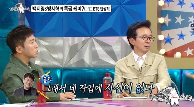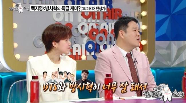 백지영은 방시혁이 자신의 앨범 작업을 거절하면서‘어떤 프로젝트에 올인하고 있다’고 밝혀 멋지게 서로 이별을 할 수 있었다고 밝혔다. 이어 “얼마 뒤 방탄소년단이 나왔다”라는 백지영의 말에MC 유세윤은 “'총 맞은 것처럼'이 방탄의 전신 같은 느낌”이라고 말을 꺼냈다. 이에 백지영은 “왜 방탄일까 그 생각을 하긴 했거든요”라고 웃었다.