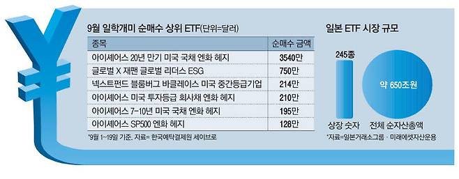 최근 일학개미의 순매수 상위 종목 10종 가운데 6종은 ETF였을 정도로 다수를 차지했다. 미국 장기채에 투자하는 아이셰어스 20년 만기 미국 국채 엔화 헤지 ETF가 3540만달러로 순매수 금액 규모가 가장 컸다.