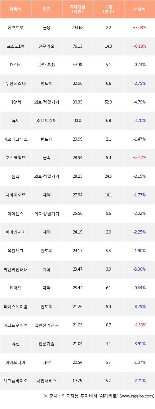 외국인 투자자의 순매수 상위 20개 종목은 에코프로, 포스코DX, JYP Ent., 두산테스나, 디알텍, 뷰노, 이오테크닉스, 포스코엠텍, 원텍, 차바이오텍등이다.
