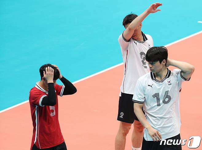 (항저우(중국)=뉴스1) 신웅수 기자 = 20일 오후 중국 항저우 린핑 스포츠센터체육관에서 열린 2022 항저우 아시안게임 남자 배구 C조 조별리그 대한민국과 인도의 경기에서 세트스코어 2대 3으로 패한 대한민국 선수들이 경기장을 나서고 있다. 2023.9.20/뉴스1