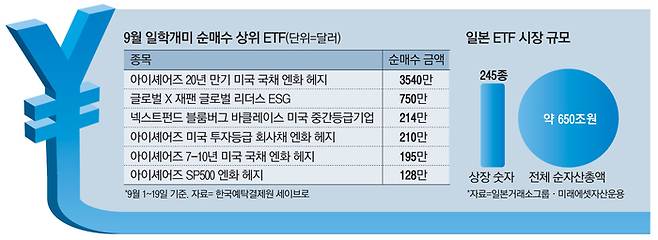 최근 일학개미들의 순매수 상위 종목 10종 가운데 6종은 ETF였을 정도로 다수를 차지했다. 미국 장기채에 투자하는 아이셰어즈 20년 만기 미 국채 엔화 헤지 ETF가 3540만달러로 순매수 금액이 가장 컸다.