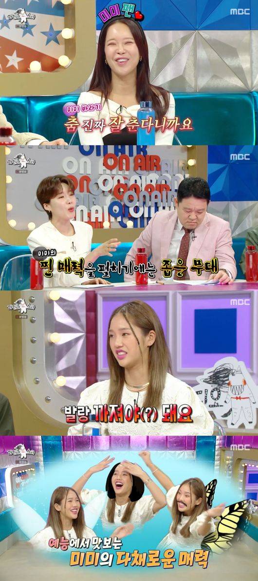 백지영 또한 미미의 팬이었다. 그는 "'지구오락실' 보고 팬이 됐다. 그런데 알고 보니 저랑 안무 팀이 같더라. 팬이라고 고백하고 사진도 같이 찍었다"라며 미미에게 반가움을 표했다. 이에 '라스' MC들이 "입술이 닮았다"라며 치켜세웠고, 백지영은 "너는 자연이냐"라고 자연스럽게 필러 등 입술 시술 이야기를 물었다. 미미는 "조금씩 넣고 한다. 모양만 살짝 다듬었다. 잇몸이 엄청 마른다. 그러면 입술이 잇몸에 붙는다"라고 고백해 웃음을 자아냈다.
