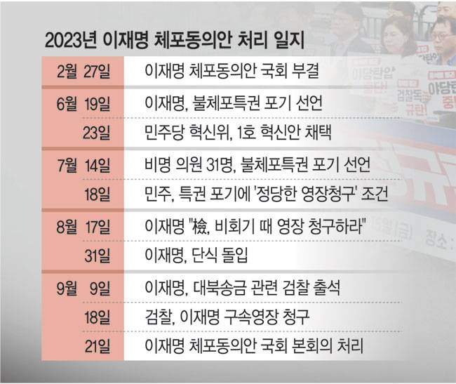 그사이 이 대표의 대응전략도 애초의 ‘불구속 기소’에서 ①체포동의안 부결이나 ②영장실질심사 기각 중에 선택하는 쪽으로 바뀌었다. 이 대표의 ‘입’은 ②번이었지만 ‘발’은 ①번이었다. 이 대표는 지난 6월 국회 교섭단체 대표연설에서 “불체포권리를 포기하겠습니다. 체포영장을 청구하면 제 발로 출석해서 영장실질심사를 받고 검찰의 무도함을 밝히겠습니다”고 선언했었다. 검찰 조사 후 검찰이 제시한 “증거가 하나도 없다”는 말도 반복했다. 그 말이 사실이라면 영장실질심사에 당당히 나가서 검찰의 무도함을 밝히고 기각을 받아냈어야 하지만, 그의 발이 향한 곳은 체포를 면하기 위한 단식장이었다.