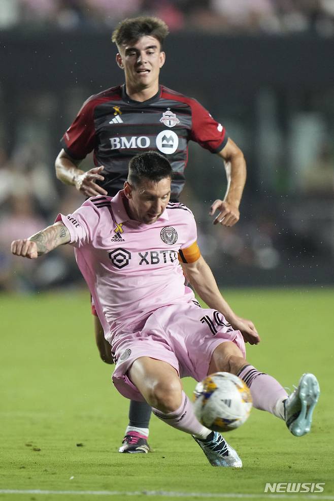 [포트 로더데일=AP/뉴시스] 인터 마이애미의 리오넬 메시가 20일(현지시각) 미 플로리다주 포트 로더데일의 DRV PNK 스타디움에서 열린 2023 메이저리그사커(MLS) 토론토FC와의 경기에 선발 출전해 공을 다투고 있다. 메시는 전반 37분 다리 통증으로 교체됐고 마이애미는 4-0으로 승리했다. 2023.09.21.