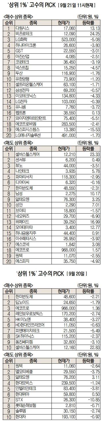 미래에셋증권은 자사 고객 중에서 지난 1개월간 수익률 상위 1% 투자자들의 매매 종목을 집계해 실시간·전일·최근 5일 기준으로 모바일트레이딩시스템(MTS)상에서 공개하고 있다. 이 통계 데이터는 미래에셋증권의 의견과 무관한 단순 정보 안내이며, 각각의 투자자 개인에게 맞는 투자 또는 수익 달성을 보장하지 않는다. 또 테마주 관련종목은 이상급등락 가능성이 있으므로 유의해야 한다.
