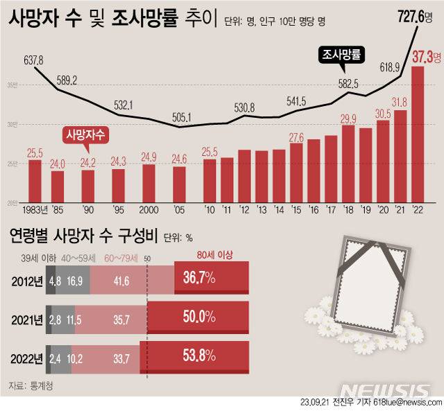 [세종=뉴시스]임하은 기자 = 지난해 사망자가 37만명을 넘어서면서 3년 연속 역대 최대치를 갈아치웠다. 코로나19 오미크론의 확산과 인구 고령화의 영향으로 80세 이상 사망자가 전체의 과반을 차지했다.